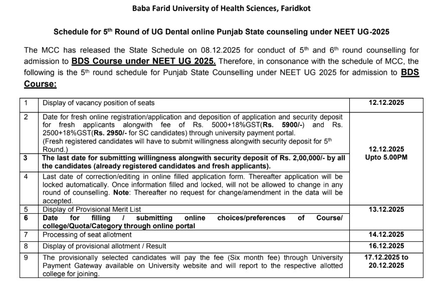 Important Notice Online Choice Filling Start From 27-01-2026 to 31-01-2026 for MD/MS/PG Diploma, DNB, Post Graduate Diploma in Sports Medicine and Six months training in Ultrasonography Courses 2025-26 Round 3rd Online Choice Filling Start From 22-12-2025 to 23-12-2025 Upto 12:00 Noon for M.B.B.S Course 2025-26 Round 5th (Special Stray) Online Choice Filling Start From 13-12-2025 for B.D.S Course 2025-26 Round 5th Online Choice Filling Start From 13-12-2025 to 15-12-2025 for MD/MS/PG Diploma, DNB, Post Graduate Diploma in Sports Medicine and Six months training in Ultrasonography Courses 2025-26 Round 2nd Online Choice Filling Start From 14-11-2025 to 15-11-2025 for M.B.B.S and B.D.S Course 2025-26 Stray Vacancy Round Online Choice Filling Start From 07-11-2025 to 10-11-2025 for MD/MS/PG Diploma, DNB, Post Graduate Diploma in Sports Medicine and Six months training in Ultrasonography Courses 2025-26 Round 1st Online Choice Filling Start From 07-11-2025 to 10-11-2025 for Bsc ALLIED HEALTHCARE COURSES, 2025-26 Round 3rd Online Choice Filling Start From 07-11-2025 to 10-11-2025 for Bsc Nursing Course 2025-26 Round 6th Online Choice Filling Start From 24-10-2025 to 26-10-2025 for Bsc Nursing Course 2025-26 Round 5th Online Choice Filling Start From 09-10-2025 to 11-10-2025 for Bsc Nursing Course 2025-26 Round 4th Online Choice Filling Start From 08-10-2025 to 10-10-2025 for M.B.B.S and B.D.S Course 2025-26 Round 3rd Online Choice Filling Start From 09-09-2025 to 12-09-2025 (upto 05:00 PM) for M.B.B.S and B.D.S Course 2025-26 Round 2nd Online Choice Filling Start From 05-09-2025 to 10-09-2025 for B.Sc Nursing Course 2025-26 Round 3rd Online Choice Filling Start From 28-08-2025 to 29-08-2025 upto 05:00PM for Stray Vacancy round of MDS Courses 2025-26 Online Choice Filling Start From 22-08-2025 to 29-08-2025 for BPT BMLS BScAPB Courses 2025-26 Round 2nd Online Choice Filling Start From 21-08-2025 to 28-08-2025 for Certificate and Diploma Courses 2025-26 Round 2nd Online Choice Filling Start From 14-08-2025 to 18-08-2025 for M.Sc. Nursing Course 2025-26 Round 2nd Online Choice Filling Start From 14-08-2025 to 18-08-2025 for Post Basic B.Sc. Nursing Course 2025-26 Round 2nd Online Choice Filling Start From 13-08-2025 to 18-08-2025 for B.Sc. Allied and Healthcare Sciences Course 2025-26 Round 2nd Online Choice Filling Start From 09.08.2025 to 11.08.2025 upto 5:00 PM for Post Gradute Dental Course (MDS) 2025-26 Round 3rd The vacancy position of seats will be automatically updated in case any candidate of round-1/2 will surrender the seat (exit with forfeiture) upto 08.08.2025 by 4:00PM. Online Choice Filling Start From 31-07-2025 to 08-08-2025 for B.Sc Nursing Course 2025-26 Round 2nd Online Choice Filling Start From 29-07-2025 to 01-08-2025 for M.B.B.S and B.D.S Course 2025-26 Round 1st Online Choice Filling Start From 19-07-2025 to 21-07-2025 for Post Gradute Dental Course (MDS) 2025-26 Round 2nd click here for view Notice regarding surrender of 1st Round seat PG MDS 2025. click here for view Click here to view: Admission in BMLS Course at CMC, Ludhiana under Christian Minority Quota – 2025 Online Choice Filling Start From 09-07-2025 to 14-07-2025 for Bsc Post Basic Course 2025-26 Round 1st Online Choice Filling Start From 09-07-2025 to 14-07-2025 for Master of Science Course(M.Sc) 2025-26 Round 1st Online Choice Filling Start From 08.07.2025 to 16.07.2025 for Bachelor of Physiotherapy (B.P.T.), Bachelor in Medical Laboratory Science (B.M.L.S.), B. Sc. (Anatomy, Physiology & Biochemistry) Course 2025-26 Round 1st Online Choice Filling Start From 04-07-2025 to 08-07-2025 for B.Sc. Allied and Healthcare Sciences Course 2025-26 Round 1st Online Choice Filling Start From 03-07-2025 to 04-07-2025 for Post Gradute Dental Course 2025-26 Round 1st Online Choice Filling Start From 01-07-2025 to 04-07-2025 for Certificate and Diploma Course 2025-26 Round 1st Online Choice Filling Start From 27-06-2025 to 04-07-2025 for BS.c Nursing Session 2025-26 Round 1st.