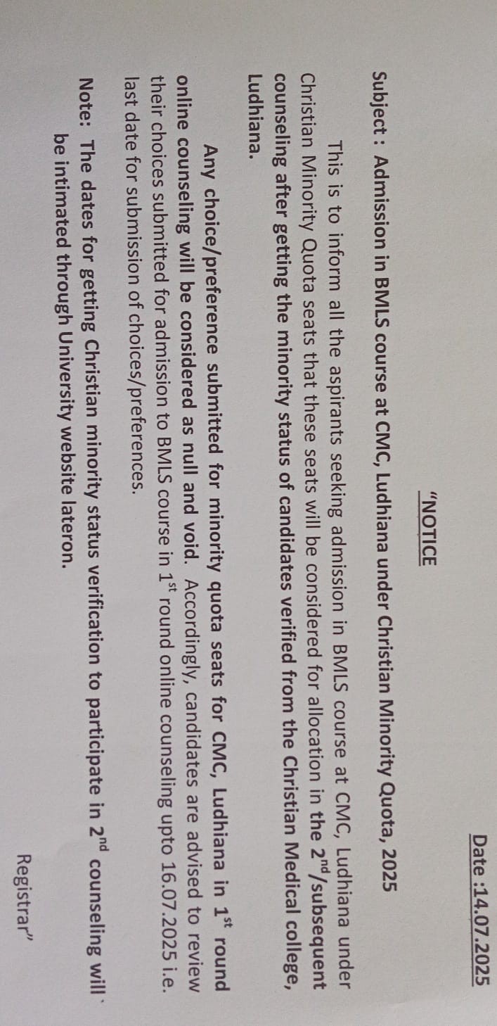 Admission in BMLS Course at CMC, Ludhiana under Christian Minority Quota – 2025 click here for view
