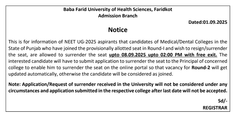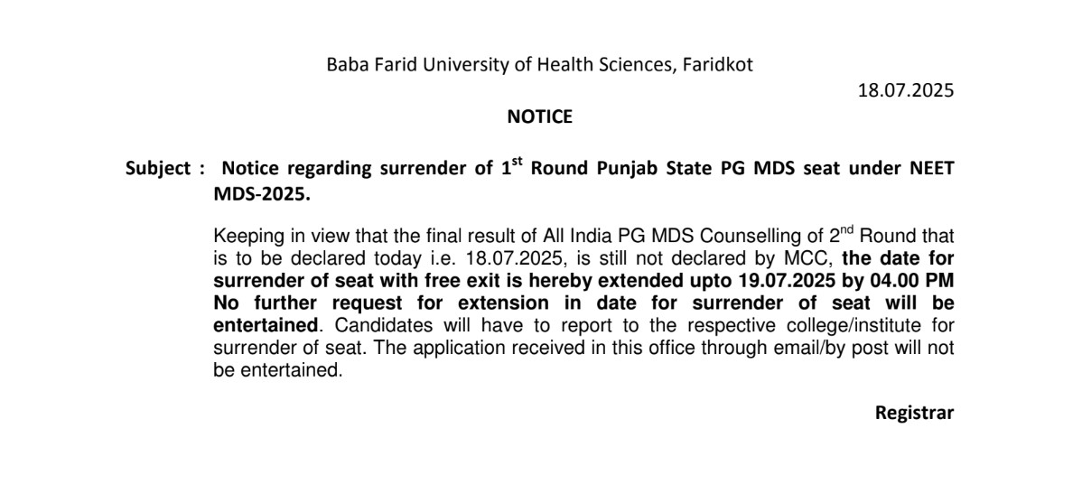 Important Notice Notice regarding surrender of 1st Round seat PG MDS 2025. click here for view