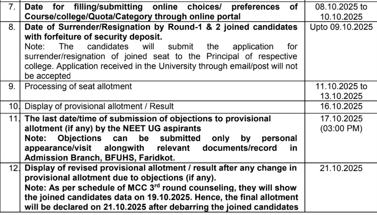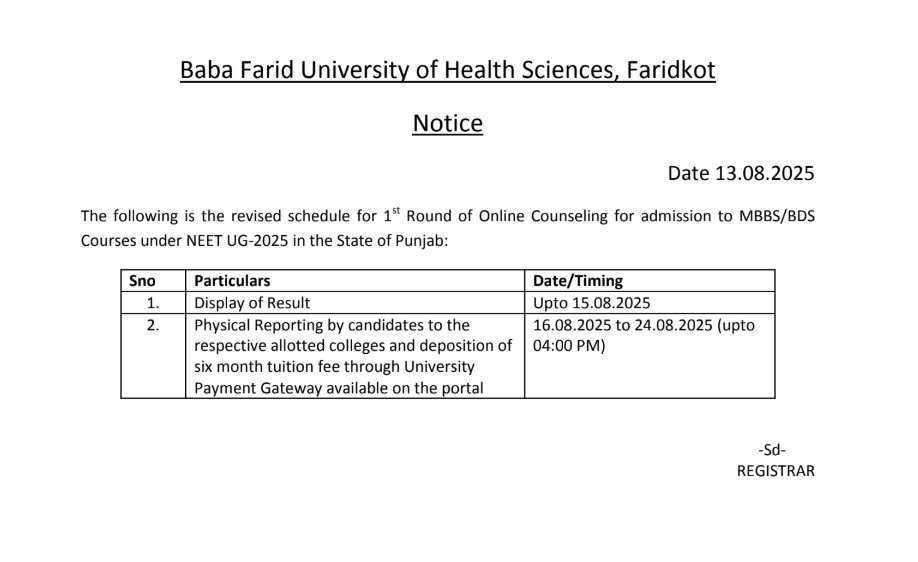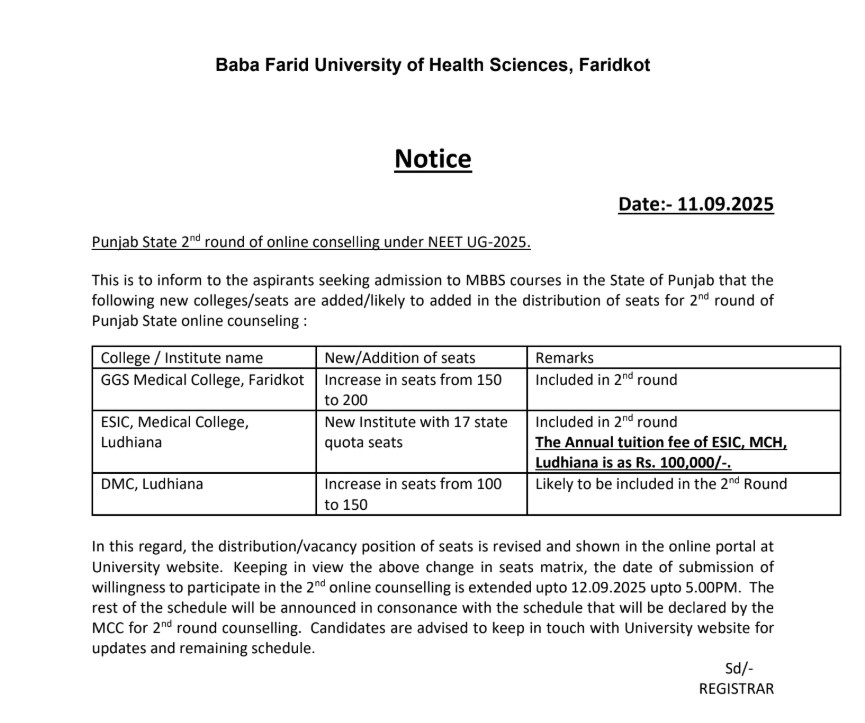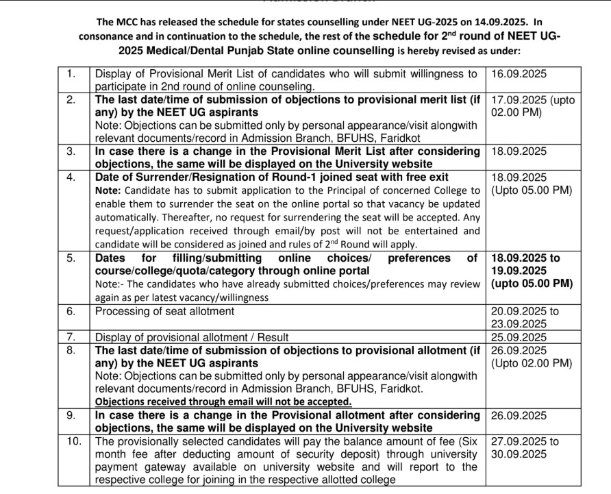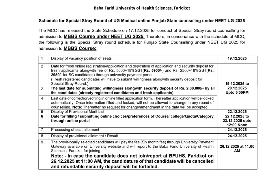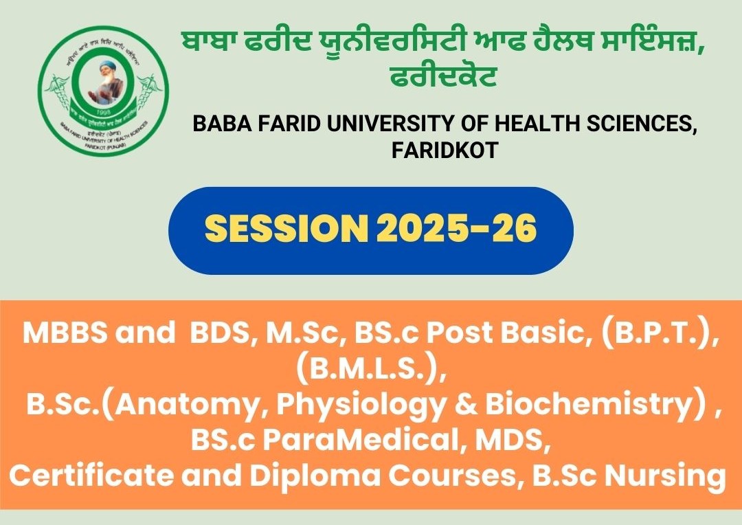 Important Notice Online Choice Filling Start From 27-01-2026 to 31-01-2026 for MD/MS/PG Diploma, DNB, Post Graduate Diploma in Sports Medicine and Six months training in Ultrasonography Courses 2025-26 Round 3rd Online Choice Filling Start From 22-12-2025 to 23-12-2025 Upto 12:00 Noon for M.B.B.S Course 2025-26 Round 5th (Special Stray) Online Choice Filling Start From 13-12-2025 for B.D.S Course 2025-26 Round 5th Online Choice Filling Start From 13-12-2025 to 15-12-2025 for MD/MS/PG Diploma, DNB, Post Graduate Diploma in Sports Medicine and Six months training in Ultrasonography Courses 2025-26 Round 2nd Online Choice Filling Start From 14-11-2025 to 15-11-2025 for M.B.B.S and B.D.S Course 2025-26 Stray Vacancy Round Online Choice Filling Start From 07-11-2025 to 10-11-2025 for MD/MS/PG Diploma, DNB, Post Graduate Diploma in Sports Medicine and Six months training in Ultrasonography Courses 2025-26 Round 1st Online Choice Filling Start From 07-11-2025 to 10-11-2025 for Bsc ALLIED HEALTHCARE COURSES, 2025-26 Round 3rd Online Choice Filling Start From 07-11-2025 to 10-11-2025 for Bsc Nursing Course 2025-26 Round 6th Online Choice Filling Start From 24-10-2025 to 26-10-2025 for Bsc Nursing Course 2025-26 Round 5th Online Choice Filling Start From 09-10-2025 to 11-10-2025 for Bsc Nursing Course 2025-26 Round 4th Online Choice Filling Start From 08-10-2025 to 10-10-2025 for M.B.B.S and B.D.S Course 2025-26 Round 3rd Online Choice Filling Start From 09-09-2025 to 12-09-2025 (upto 05:00 PM) for M.B.B.S and B.D.S Course 2025-26 Round 2nd Online Choice Filling Start From 05-09-2025 to 10-09-2025 for B.Sc Nursing Course 2025-26 Round 3rd Online Choice Filling Start From 28-08-2025 to 29-08-2025 upto 05:00PM for Stray Vacancy round of MDS Courses 2025-26 Online Choice Filling Start From 22-08-2025 to 29-08-2025 for BPT BMLS BScAPB Courses 2025-26 Round 2nd Online Choice Filling Start From 21-08-2025 to 28-08-2025 for Certificate and Diploma Courses 2025-26 Round 2nd Online Choice Filling Start From 14-08-2025 to 18-08-2025 for M.Sc. Nursing Course 2025-26 Round 2nd Online Choice Filling Start From 14-08-2025 to 18-08-2025 for Post Basic B.Sc. Nursing Course 2025-26 Round 2nd Online Choice Filling Start From 13-08-2025 to 18-08-2025 for B.Sc. Allied and Healthcare Sciences Course 2025-26 Round 2nd Online Choice Filling Start From 09.08.2025 to 11.08.2025 upto 5:00 PM for Post Gradute Dental Course (MDS) 2025-26 Round 3rd The vacancy position of seats will be automatically updated in case any candidate of round-1/2 will surrender the seat (exit with forfeiture) upto 08.08.2025 by 4:00PM. Online Choice Filling Start From 31-07-2025 to 08-08-2025 for B.Sc Nursing Course 2025-26 Round 2nd Online Choice Filling Start From 29-07-2025 to 01-08-2025 for M.B.B.S and B.D.S Course 2025-26 Round 1st Online Choice Filling Start From 19-07-2025 to 21-07-2025 for Post Gradute Dental Course (MDS) 2025-26 Round 2nd click here for view Notice regarding surrender of 1st Round seat PG MDS 2025. click here for view Click here to view: Admission in BMLS Course at CMC, Ludhiana under Christian Minority Quota – 2025 Online Choice Filling Start From 09-07-2025 to 14-07-2025 for Bsc Post Basic Course 2025-26 Round 1st Online Choice Filling Start From 09-07-2025 to 14-07-2025 for Master of Science Course(M.Sc) 2025-26 Round 1st Online Choice Filling Start From 08.07.2025 to 16.07.2025 for Bachelor of Physiotherapy (B.P.T.), Bachelor in Medical Laboratory Science (B.M.L.S.), B. Sc. (Anatomy, Physiology & Biochemistry) Course 2025-26 Round 1st Online Choice Filling Start From 04-07-2025 to 08-07-2025 for B.Sc. Allied and Healthcare Sciences Course 2025-26 Round 1st Online Choice Filling Start From 03-07-2025 to 04-07-2025 for Post Gradute Dental Course 2025-26 Round 1st Online Choice Filling Start From 01-07-2025 to 04-07-2025 for Certificate and Diploma Course 2025-26 Round 1st Online Choice Filling Start From 27-06-2025 to 04-07-2025 for BS.c Nursing Session 2025-26 Round 1st.