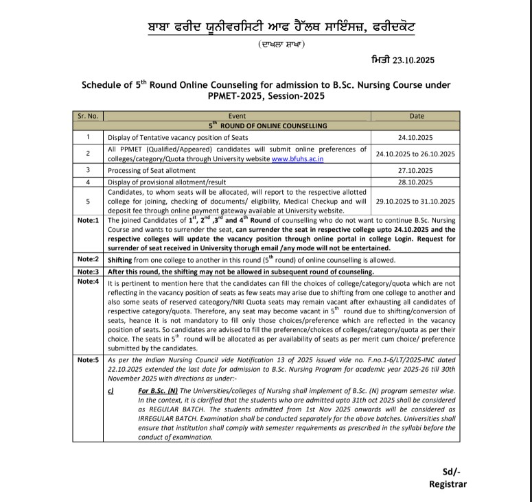 Online Choice Filling Start From 24-10-2025 to 26-10-2025 for Bsc Nursing Course 2025-26 Round 5th