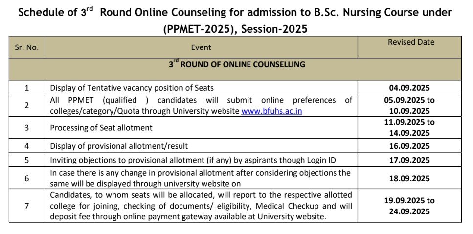 Online Choice Filling Start From 05-09-2025 to 10-09-2025 for B.Sc Nursing Course 2025-26 Round 3rd